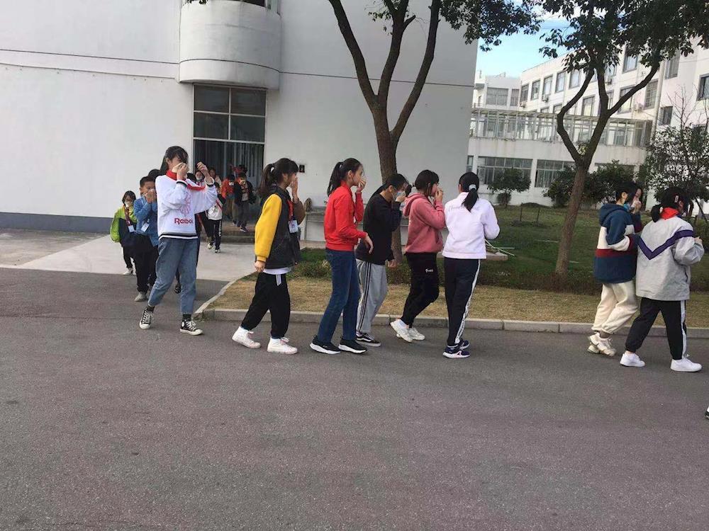 18日下午14:55,警报铃声响起,演练开始,全体工作人员马上进入指定位置,学生们在老师的组织下,右手用湿纸巾等捂住口鼻,弯腰撤离教学楼,快速到达指定位置。各班体委向德育处老师汇报实到人数。整个过程安全平稳地进行。