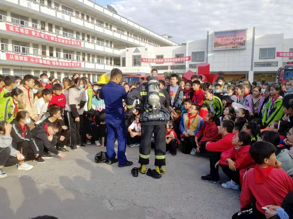 消防疏散演练之后,甪直消防中队的队长和队员给师生们开展了消防知识讲座、简易灭火器灭火培训、参观消防车、消防服和装备穿戴演示以及接消防栓等活动。