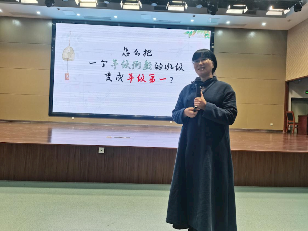 活动有幸地邀请到了全国模范教师于洁老师,为班主任们带来了题为“怎么把一个年级倒数的班级变成年级第一”的讲座。