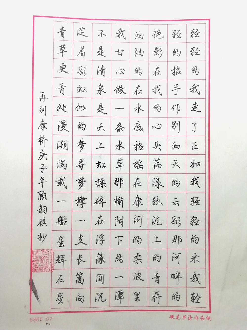 顾云琪自述:谈及书法,我与它也算有段奇缘。我母亲写得一手好字,她自然希望我亦能如此。可并不如愿,儿时的我并不喜欢写字。倒是后来,学校有书法考级之事,我极想参加。母亲是唯一支持我的,我也认真起来了。一个暑假,每日五页字,我便在这墨香中渐渐成长起来了。一路来,也获得不少奖项。原来成功最需要的还是坚持。但最能让我开心的不过是在忙碌的学业中偶能闻到这淡淡的清香,便足矣。