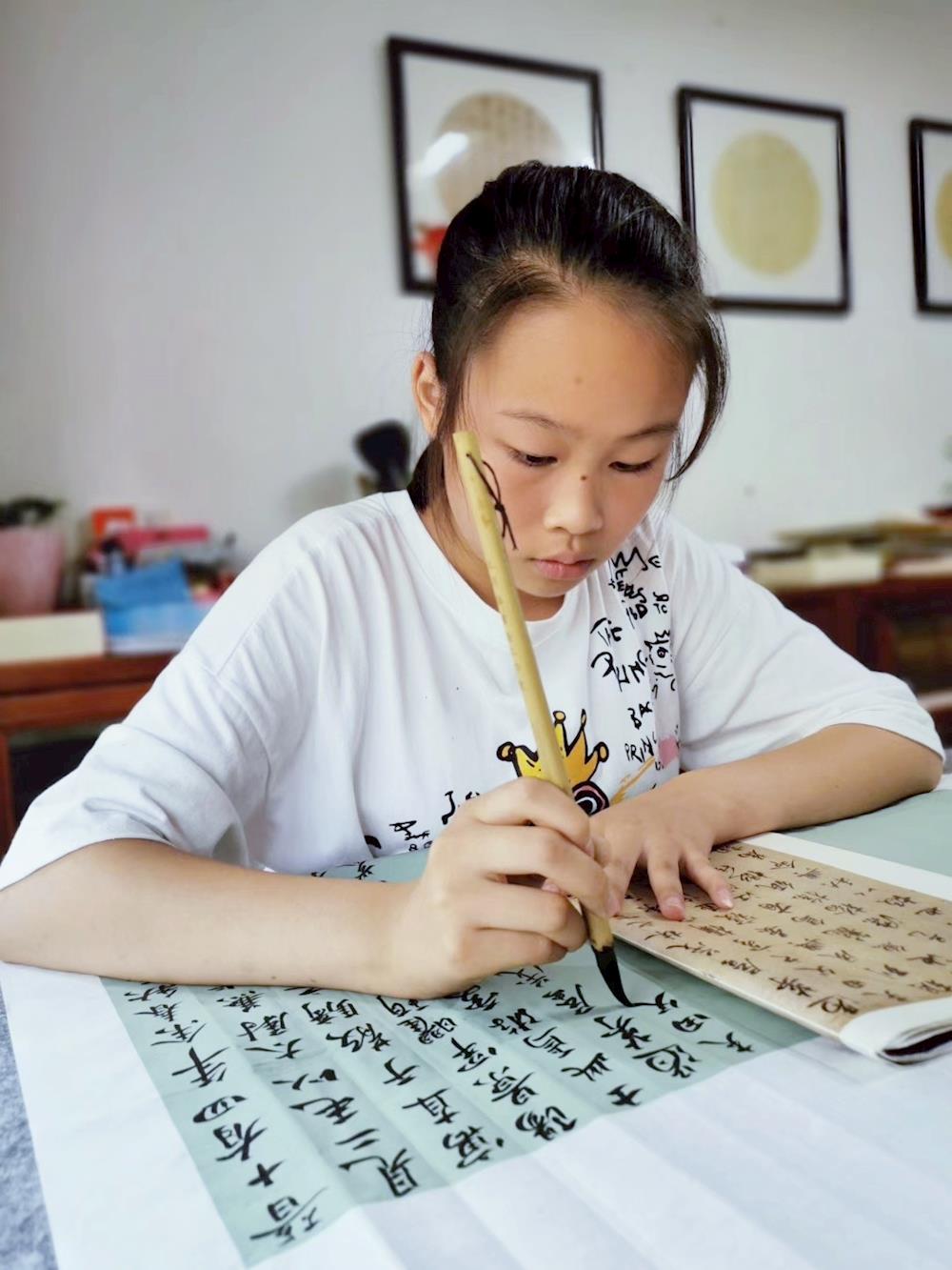 书法于朱慧而言,早已不是写字那么简单,抚摸纸面,感受那份提笔收笔间的凹凸起伏,点撇竖横间,似乎迸发出一股力,由指尖到每一根寒毛,原来,日渐月染下,汉字的基因,早已悄悄融入她的血脉。而她只愿能做秋千下永远的墨案人。